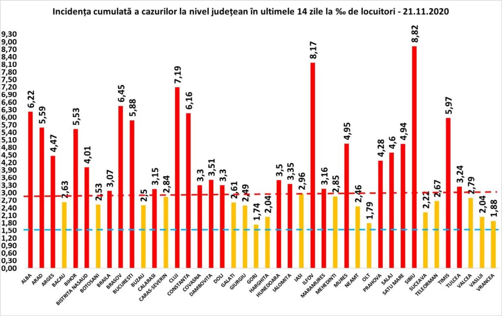 Până astăzi, 21 noiembrie, pe teritoriul României, au fost confirmate 412.808 cazuri de persoane infectate cu noul coronavirus (COVID – 19). 287.310 de pacienți au fost declarați vindecați. În urma testelor efectuate la nivel național, față de ultima raportare, au fost înregistrate 9.685 cazuri noi de persoane infectate cu SARS – CoV – 2 (COVID – 19), acestea fiind cazuri care nu au mai avut anterior un test pozitiv. Coeficientul infectărilor cumulate la 14 zile, raportate la 1.000 de locuitori este calculat de către Direcțiile de Sănătate Publică, la nivelul Municipiului București și al județelor. Mai jos aveți graficul realizat în baza raportărilor primite de CNCCI de la Direcțiile de Sănătate Publică: