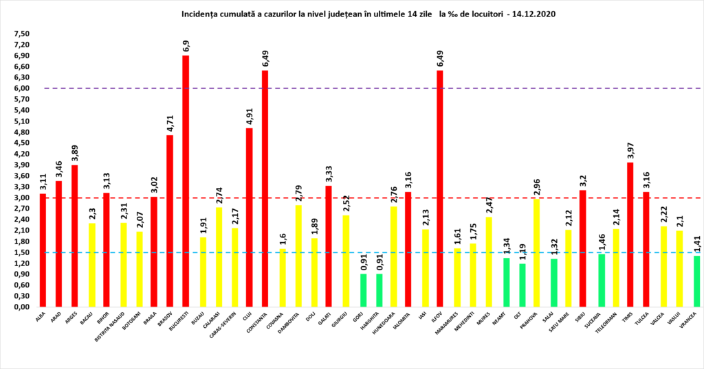Până astăzi, 14 decembrie, pe teritoriul României, au fost confirmate 559.587 de cazuri de persoane infectate cu noul coronavirus (COVID – 19). 460.780 de pacienți au fost declarați vindecați. În urma testelor efectuate la nivel național, față de ultima raportare, au fost înregistrate 3.252 cazuri noi de persoane infectate cu SARS – CoV – 2 (COVID – 19), acestea fiind cazuri care nu au mai avut anterior un test pozitiv. Coeficientul infectărilor cumulate la 14 zile, raportate la 1.000 de locuitori este calculat de către Direcțiile de Sănătate Publică, la nivelul Municipiului București și al județelor. Mai jos aveți graficul realizat în baza raportărilor primite de CNCCI de la Direcțiile de Sănătate Publică: