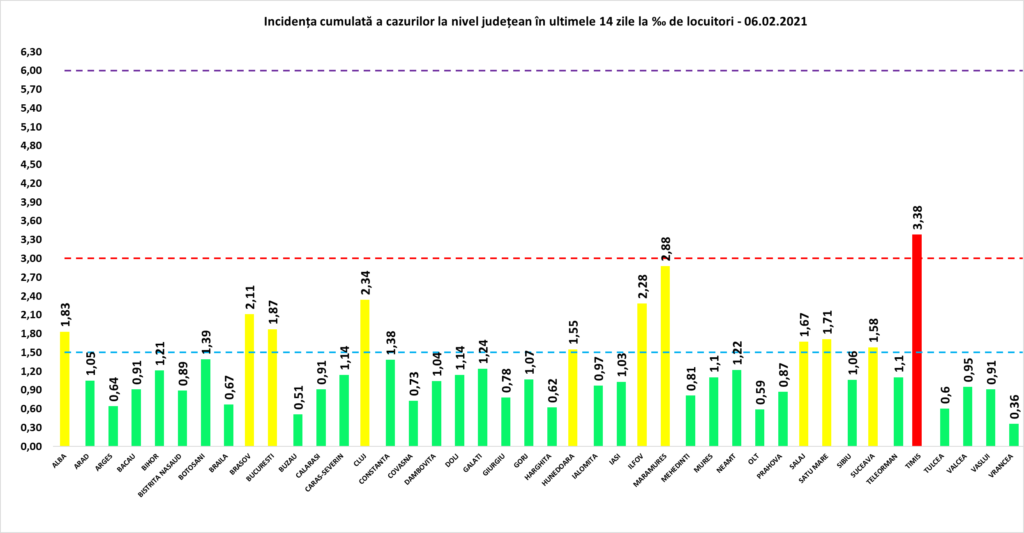 Până astăzi, 6 februarie, pe teritoriul României, au fost confirmate 743.343 de cazuri de persoane infectate cu noul coronavirus (COVID – 19). 689.474 de pacienți au fost declarați vindecați. În urma testelor efectuate la nivel național, față de ultima raportare, au fost înregistrate 2.611 cazuri noi de persoane infectate cu SARS – CoV – 2 (COVID – 19), acestea fiind cazuri care nu au mai avut anterior un test pozitiv. Coeficientul infectărilor cumulate la 14 zile, raportate la 1.000 de locuitori este calculat de către Direcțiile de Sănătate Publică, la nivelul Municipiului București și al județelor. Mai jos aveți graficul realizat în baza raportărilor primite de CNCCI de la Direcțiile de Sănătate Publică: