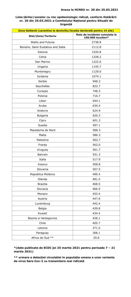 Lista țărilor pe care România le consideră cu risc epidemiologic ridicat a fost actualizată vineri seară de Comitetul Național pentru Situații de Urgență. Persoanele care sosesc în România din aceste țări, regiuni sau teritorii incluse în așa-numita „zonă galbenă” trebuie să stea în carantină timp de 14 zile. CNSU a decis să scoată Marea Britanie din zona galbenă, astfel că cei care vin în România din acest stat nu vor mai fi nevoiți să stea în carantină.