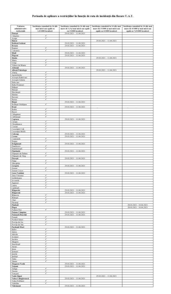 Pentru acele U.A.T.-uri unde rata de incidență este egală sau mai mare de 4/1000 locuitori, măsurile adoptate de C.J.S.U. se aplică pentru 14 zile, începând cu data de 29.03.2021, iar unde rata de infectare este mai mare de 4/1000 locuitori, deciziile intră în vigoare din data de 28.03.2021, fiind valabile tot pentru o perioadă de două săptămâni.