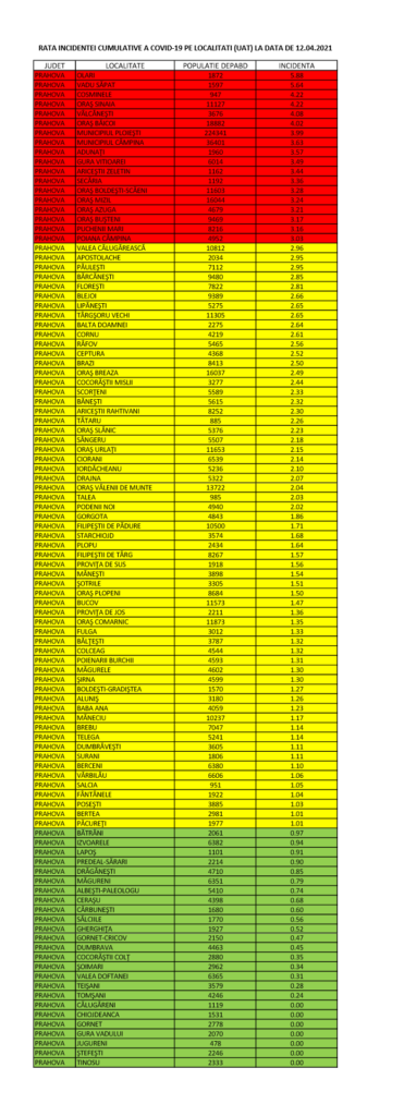 Ploieștiul a ajuns la o rată a cazurilor noi de 3,99 la o mie de locuitori! Doar Olari, Vadu Săpat, Cosminele, Sinaia, Vâlcănești și Băicoi sunt localitățile unde a fost depășit pragul de 4‰, iar restricții speciale se aplică pe durata week-endului. În total, 18 localități au o rată de peste 3‰, 36 în intervalul 1,5-3‰ și 50 sub o rată de 1,5‰. Fără cazuri noi, în ultimele 14 zile sunt doar 7 localități.