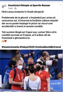 „Fără Larisa Iordache în finală olimpică! Problemele de la gleznă o împiedică pe Larisa să concureze azi. A încercat la încălzire câteva mișcări dar ea nu poate împinge în picior iar riscul unei accidentări e imens în aceste condiții. Toți suntem lângă ea! Capul sus, Larisa! Știm că în condiții normale ai fi luptat, ai fi arătat cât de frumoasă e gimnastica ta”, se arată într-o postare publicată pe pagina de Facebook a COSR.