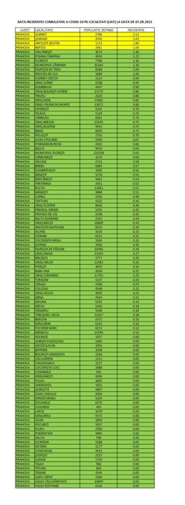 Conform datelor oficiale transmise de DSP Prahova, restul de 100 de localități se află în zona verde. În 35 de localități nu au fost raportate cazuri noi în ultimele 14 zile.