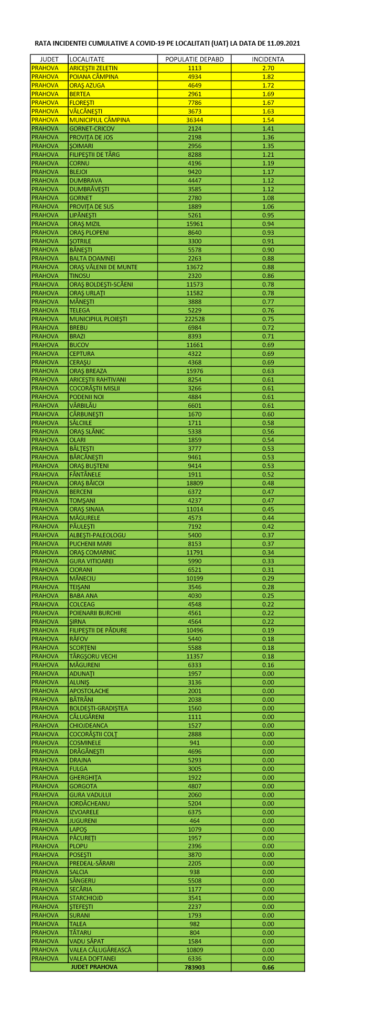 Conform datelor oficiale, primite de la DSP Prahova, 7 localități au o rată a cazurilor noi de COVID-19 de peste 1,5 la 1.000 de locuitori. Municipiul Câmpina și orașul Azuga se află printre ele.