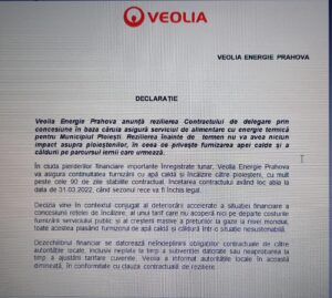 „În ciuda pierderilor financiare importante înregistrate lunar, Veolia Energie Prahova va asigura continuitatea furnizării cu apă caldă și încălzire către ploieșteni, cu mult peste cele 90 de zile stabilite contractual, încetarea contractului având loc abia la data de 31.03.2022, când sezonul rece va fi închis legal. Decizia vine în contextul conjugat al deteriorării accelerate a situației financiare a concesiunii rețelei de încălzire, al unui tarif care nu acoperă nici pe departe costurile furnizării serviciului public și al creșterii masive a prețurilor la gaze la nivel mondial, toate acestea plasând furnizorul de apă caldă și căldură într-o situație nesustenabilă. Dezechilibrul financiar se datorează neîndeplinirii obligațiilor contractuale de către autoritățile locale, inclusiv neplata la timp a subvenției datorate sau neaprobarea la timp a ajustării tarifare cuvenite. Veolia a informat autoritățile locale în această dimineață, în conformitate cu clauza contractuală de reziliere”, precizează Veolia.