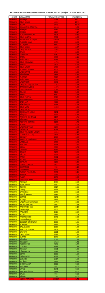 Conform situație transmise de către DSP Prahova, la nivelul județului rata de incidență a cazurilor noi de COVID- 19 a ajuns la 6,41 la 1.000 de locuitori. Cele mai afectate localități sunt: Păulești- 14,47‰; Sinaia- 12,53‰; Blejoi- 11,40‰.
