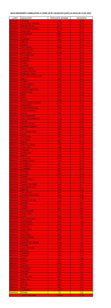 Conform datelor primite de la DSP Prahova, o singură localitate din județ se mai află în scenariul galben: comuna Tătaru. Restul de 103 localități sunt în scenariul roșu.