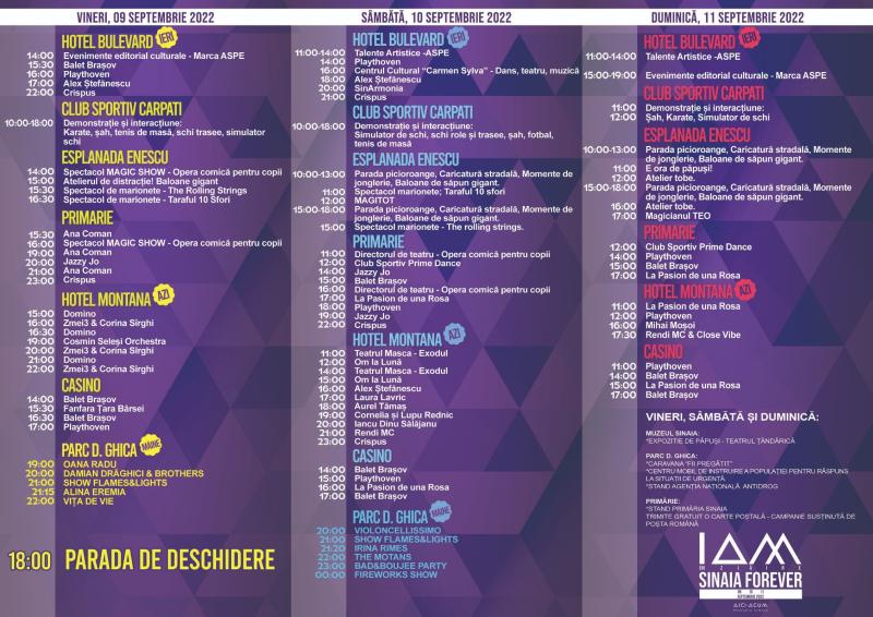 În perioada 09 -11 septembrie se va desfășura cea de-a XXVII-a ediție a Festivalului Sinaia Forever. Startul distracției va fi dat la vineri la ora 18.00, o dată cu grandioasa Paradă de Deschidere a Festivalui Sinaia Forever, “I Am Sinaia”, în care își vor găsi locul toți participanții, invitații și spectatorii. Toți împreună vom simți fiorul treceri prin cele 3 porți alegorice, traversând centrului orașului și parcurgând cele trei zone care reprezintă tema Festivalului.