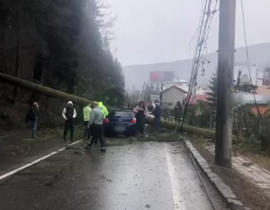 Update: copacul a fost îndepărtat. Acesta lovise și un stâlp de electricitate și un gard. Traficul se desfășoară cu greu, alternativ! Conducătoarea auto în vârstă de 32 de ani și un pasager de 35 de ani vor fi transportați la o unitate medicală pentru acordarea de îngrijiri de specialitate.