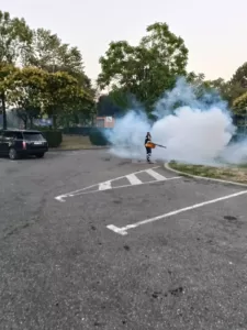 Activităţile se realizează cu ajutorul unor utilaje de mare putere, montate pe autovehicule cu randament ridicat, care pulverizează, concomitent, ceaţă caldă şi rece.