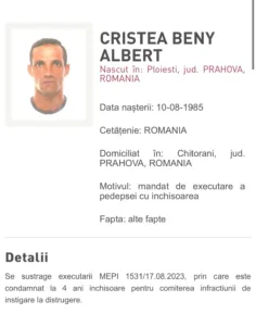 De asemenea, a fost adus un bărbat de 38 de ani- Cristea Beny Albert, domiciliat în Prahova, urmărit internaţional pentru distrugere. Acesta a fost adus din Spania, având emis de către Judecătoria Ploieşti, pe numele lui, un mandat de executare a pedepsei cu închisoarea de 4 ani.