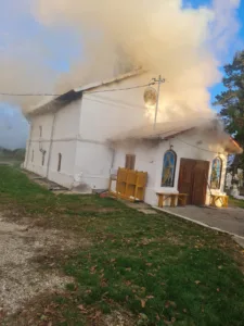 Un incendiu a izbucnit luni la acoperișul unei biserici din localitatea Poienarii Burchii, sat Podu Văleni. La sosirea echipajelor, pompierii au constatat că flăcările se manifestau violent la acoperișul lăcașului de cult, pe o suprafață de aproximativ 200 de metri pătrați.